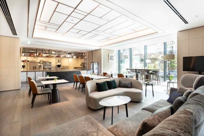 Mo:take STUDIO 赤坂はホテルロビーのような上品で明るい空間とゆったりとしたソファ席。