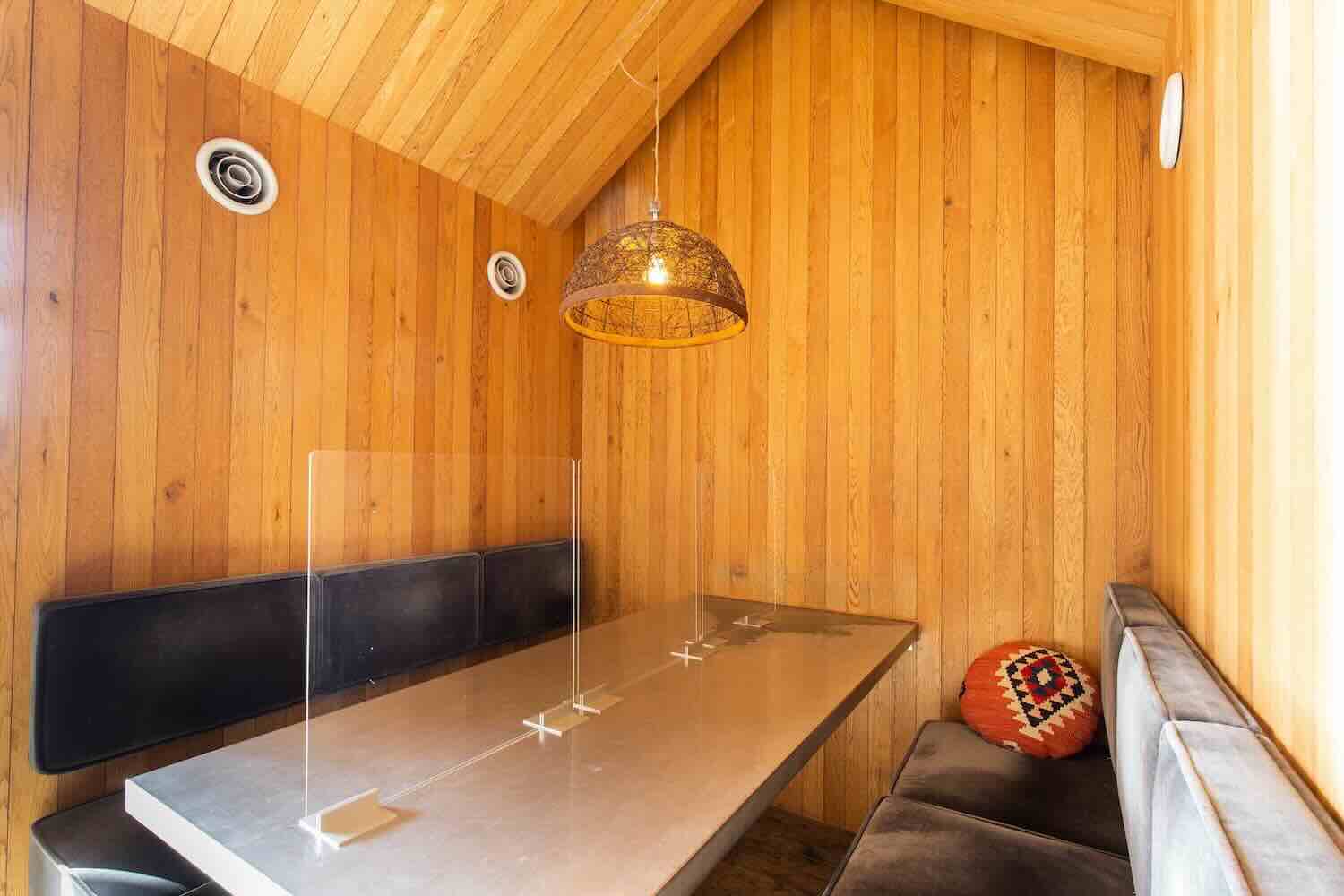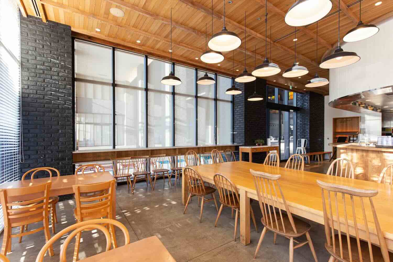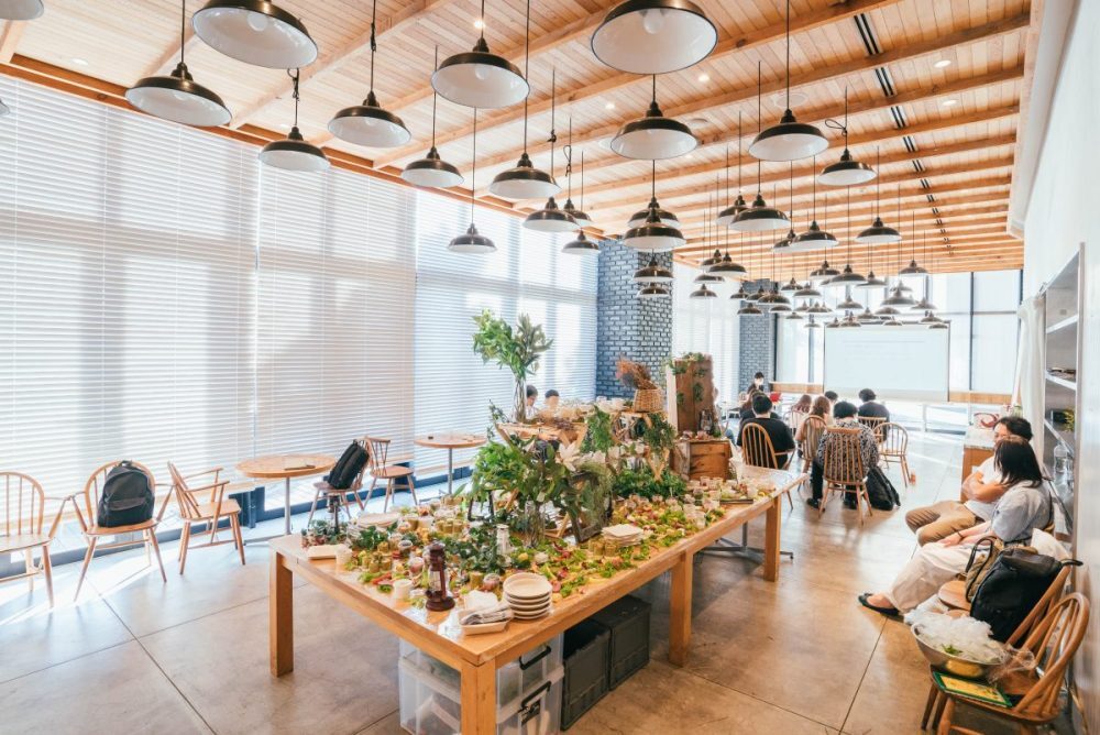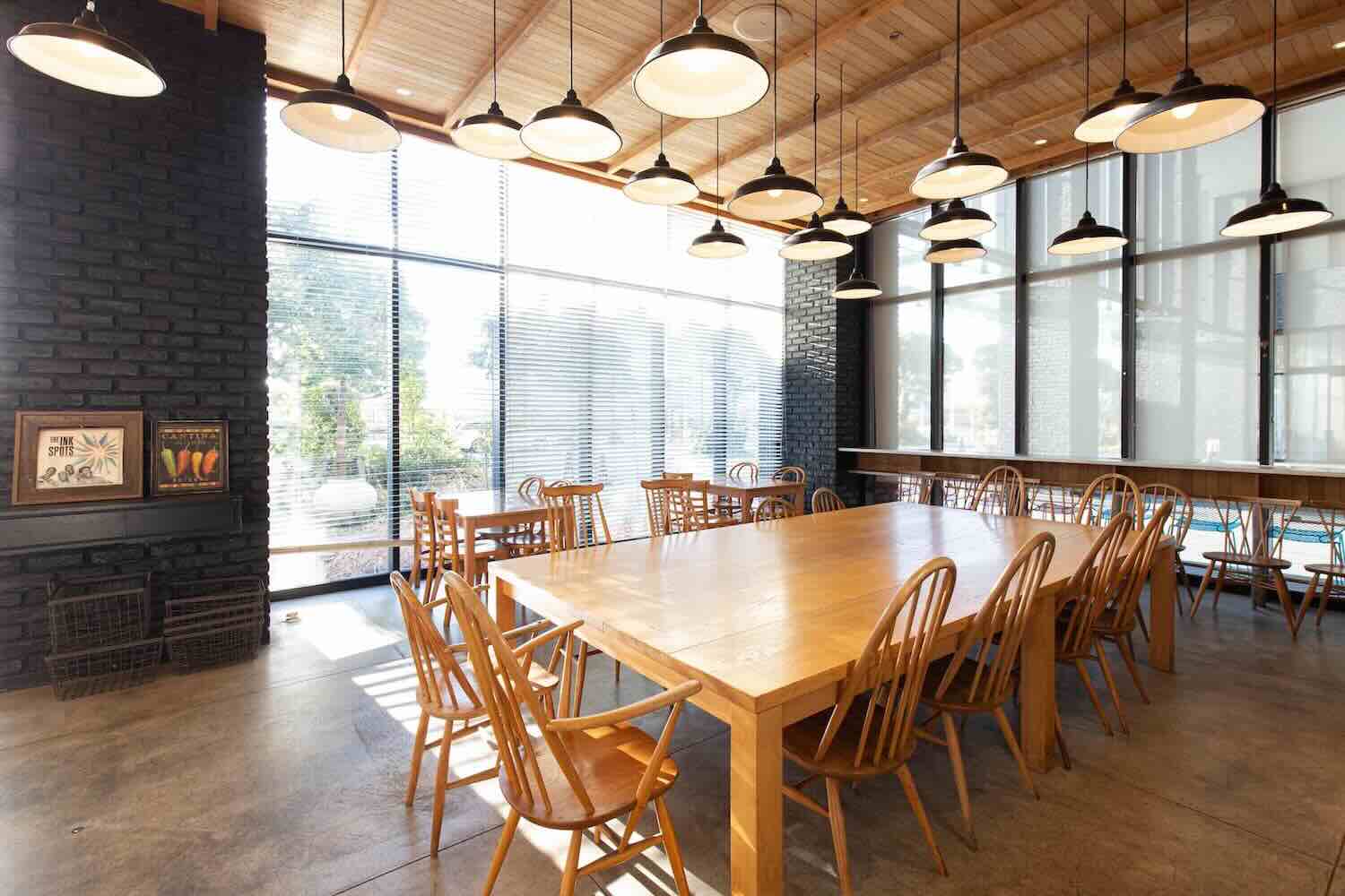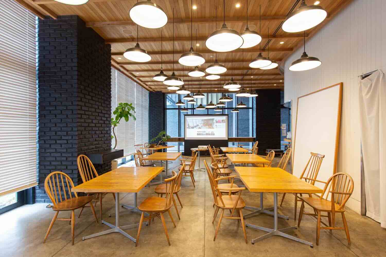ウッドベースのインテリアに高い天井と大きな窓による開放的な空間は、長い時間でも過ごしやすく、オフサイトミーティングや社内合宿におすすめです。