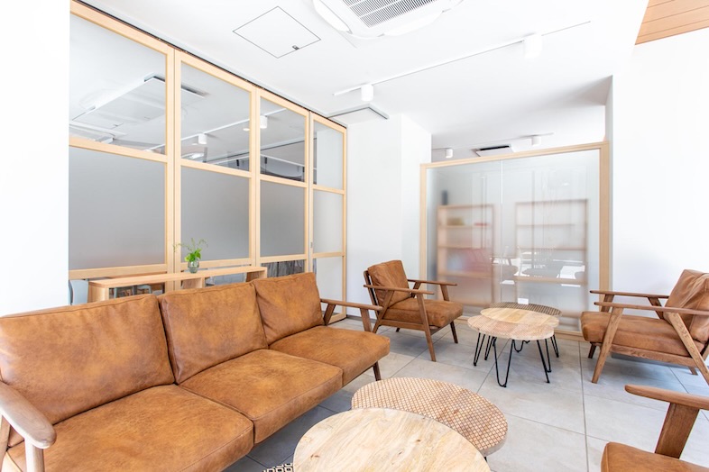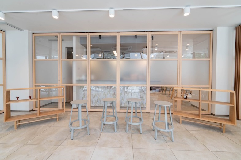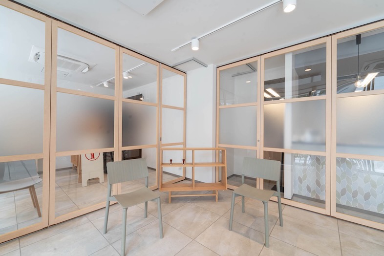 A・B・Cのスペースを、木枠のパーテーションで仕切ることもできるため、撮影時の控室や背景として活用してもよし、イベント時は、グループワークや相談会として区切って使用してもいい、汎用性の高い仕様となっております。